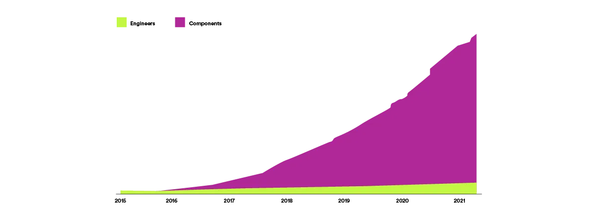 图示:图表显示了从 2015 年到 2021 年 Spotify 的工程师数量(绿色)和组件数量(紫色)的增长趋势。组件数量的显著增长反映了软件复杂性的增加。