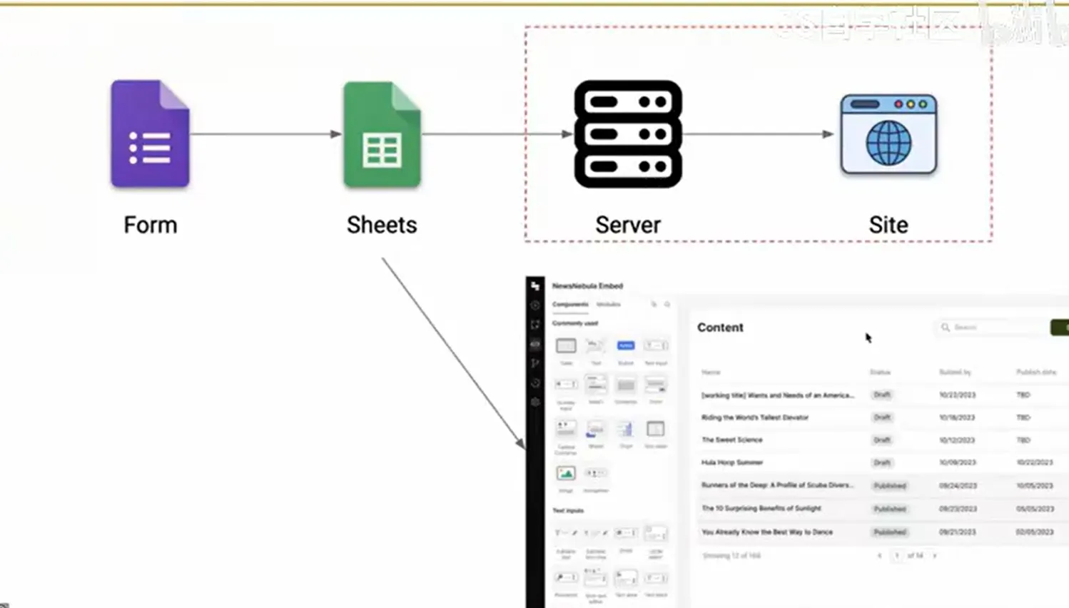 - 一个服务器(后端)从资源(Google Sheets)获取数据。